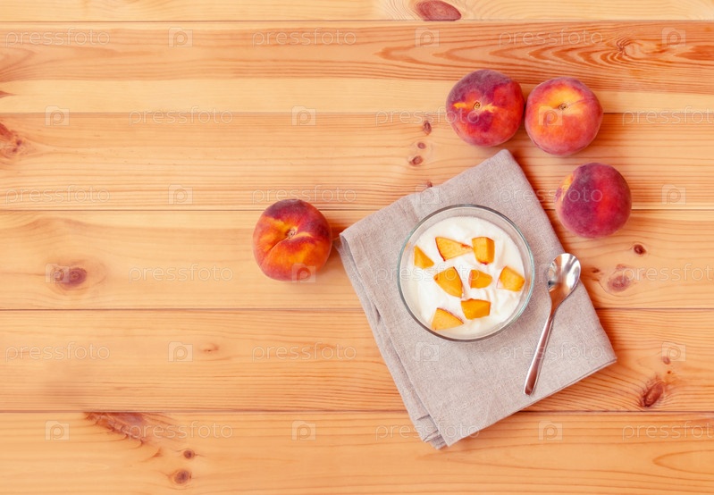 Йогурт со свежими ломтиками персика на деревянном столе