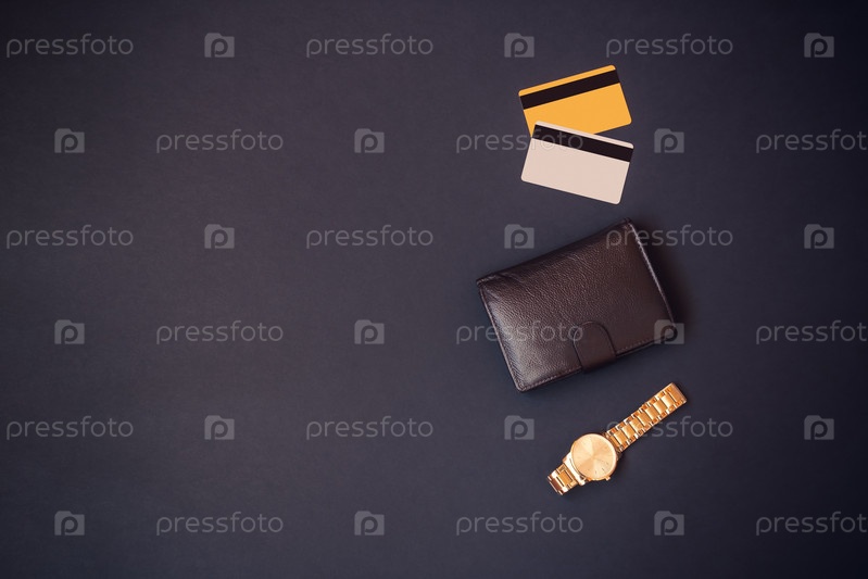Кошелек, часы и кредитные карты на темном фоне