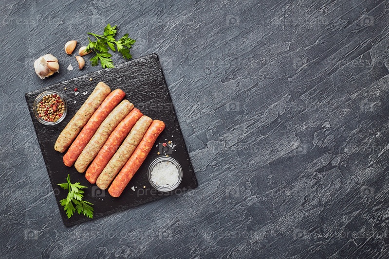 Сырые колбаски мясников на грифельной доске с травами. Вид сверху