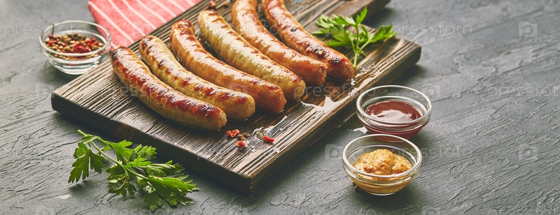 Вкусные свиные колбаски на гриле со специями и травами на деревянной разделочной доске крупным планом на черном фоне. Вид сверху, плоская планировка