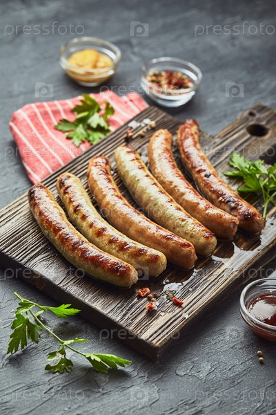 Вкусные свиные колбаски на гриле со специями и травами на деревянной разделочной доске крупным планом на черном фоне. Вид сверху, плоская планировка