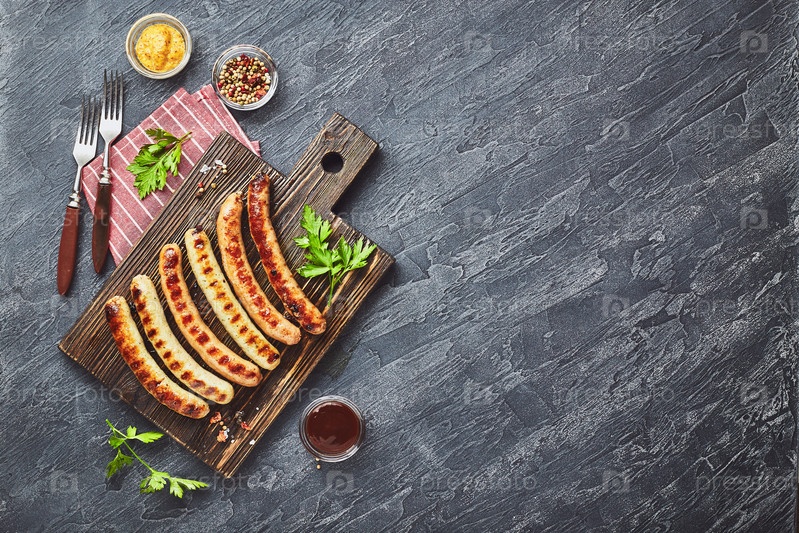 Вкусные свиные колбаски на гриле со специями и травами на деревянной разделочной доске крупным планом на черном фоне. Вид сверху, плоская планировка