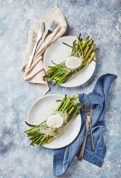 Зеленая спаржа с яйцом-пашот и пармезаном, вегетарианский завтрак подается на белой тарелке на светлом фоне