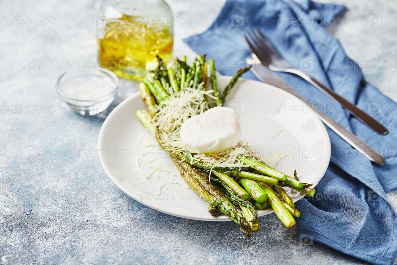 Зеленая спаржа с яйцом-пашот и пармезаном, вегетарианский завтрак подается на белой тарелке на светлом фоне