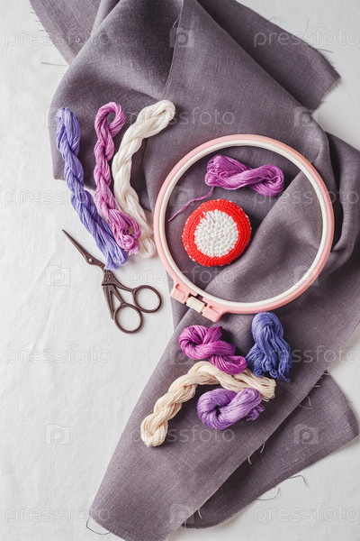 Набор для вышивки. Льняная ткань, схемы для вышивки, пяльцы, цветные нитки и иголки