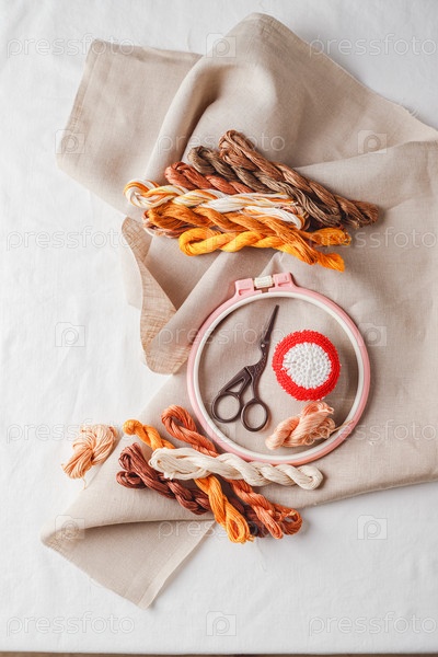 Набор для вышивки. Льняная ткань, схемы для вышивки, пяльцы, цветные нитки и иголки