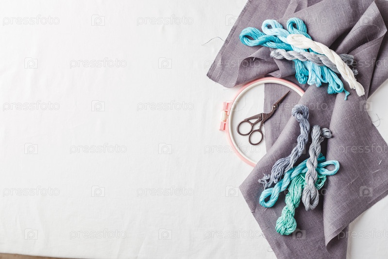 Набор для вышивки. Льняная ткань, схемы для вышивки, пяльцы, цветные нитки и иголки