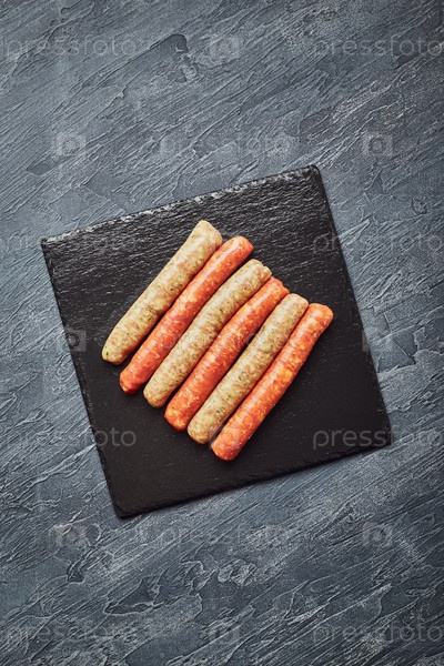 Сырые мясные колбаски на грифельной доске. Вид сверху