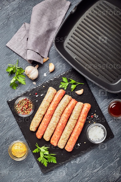 Колбаски из сырого мяса на грифельной доске, с травами и специями и квадратной сковородой для гриля. Вид сверху