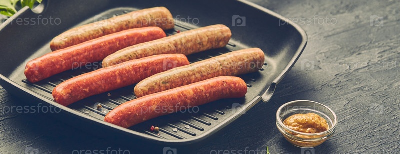 Колбаски из сырого мяса на квадратной сковороде-гриль, с травами и специями. Вид сверху