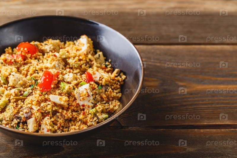 Кус-кус с индейкой, помидорами, шампиньонами и авокадо