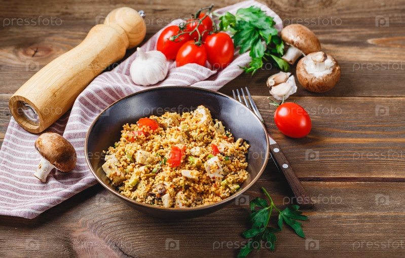Кус-кус с индейкой, помидорами, шампиньонами и авокадо