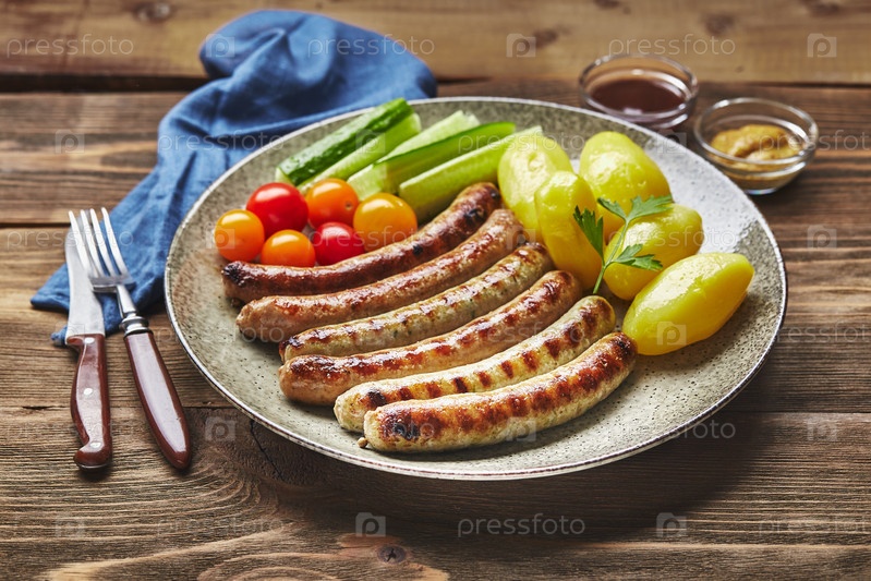 Вкусные жареные колбаски с картофелем и овощами на тарелке крупным планом на деревянном фоне. Вид сверху, плоская планировка