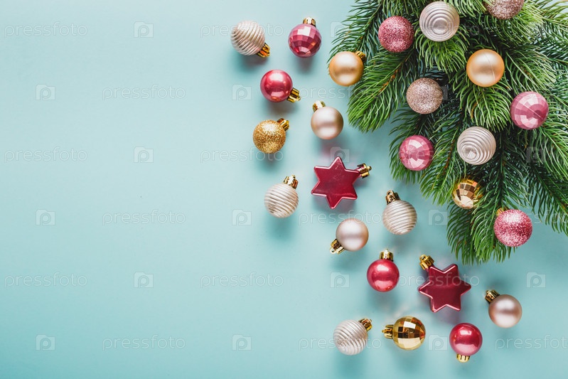 Много новогодних шаров золотого и розового цвета