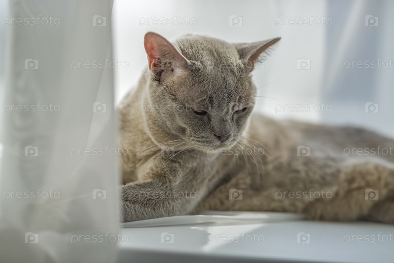 Домашний бирманский кот, серый с желтыми глазами, в многоквартирном доме города. Он эффектно лежит на подоконнике. Естественная среда обитания