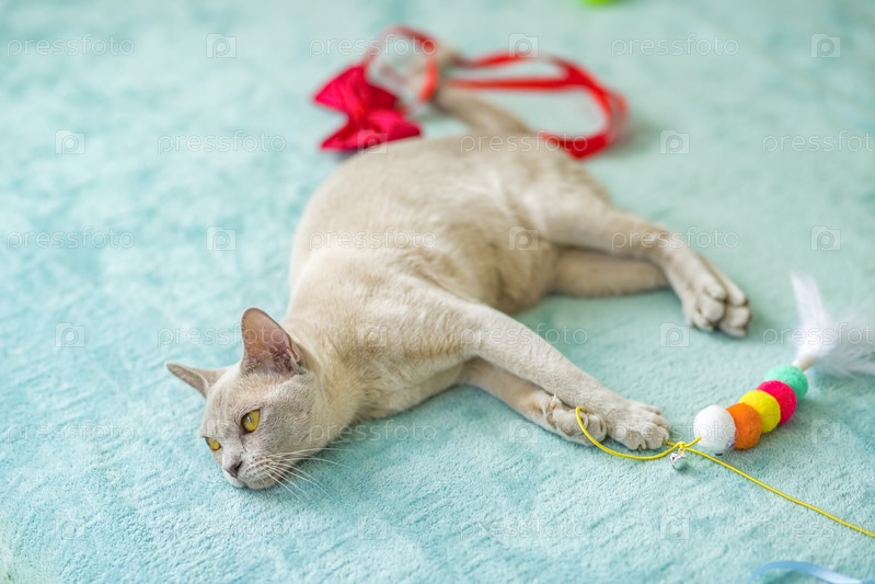 Домашняя кошка бирманской породы, игривая и активная, в многоквартирном доме города. Любит игрушки и бантики. Глаза счастливого питомца, играющего и желающего напасть