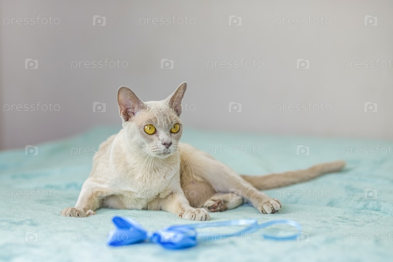 Домашняя кошка бирманской породы, игривая и активная, в многоквартирном доме города. Любит игрушки и бантики. Глаза счастливого питомца, играющего и желающего напасть