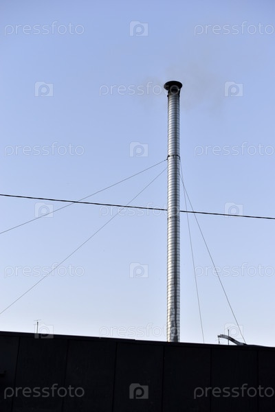 Металлическая серебряная труба с дымом на фоне неба. Длинный дымоход