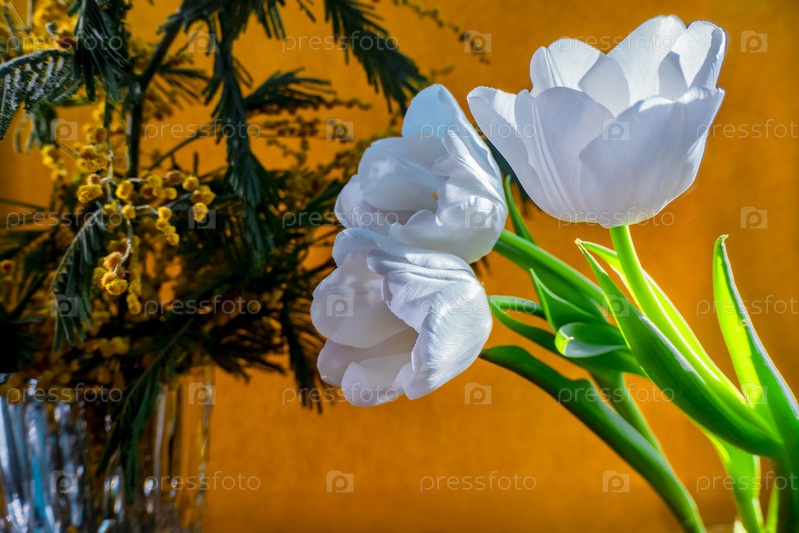 Белый тюльпан и мимоза на оранжевом фоне