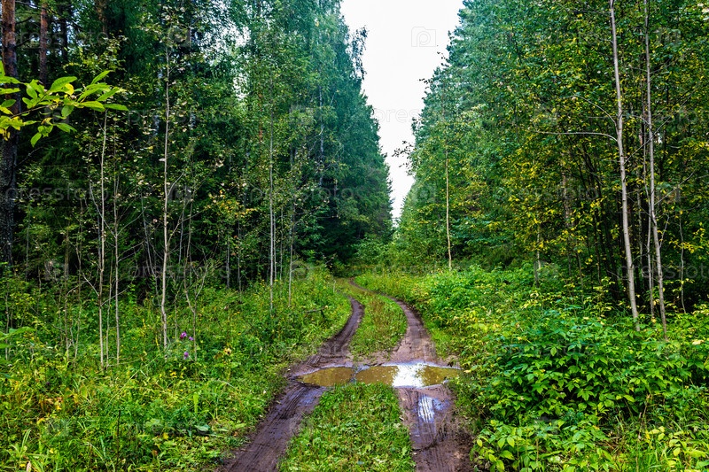 Грунтовая дорога с лужей в лесу