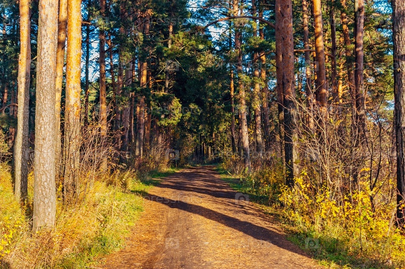 Грунтовая дорога в осеннем лесу в солнечный день