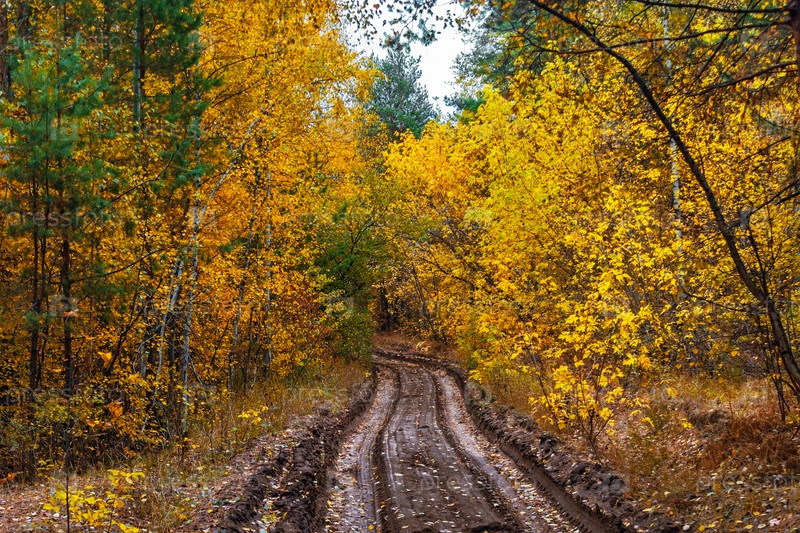 Грунтовая дорога в осеннем лесу в дождливый день
