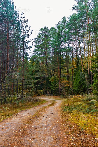 Грунтовая дорога в осеннем лесу в пасмурный день