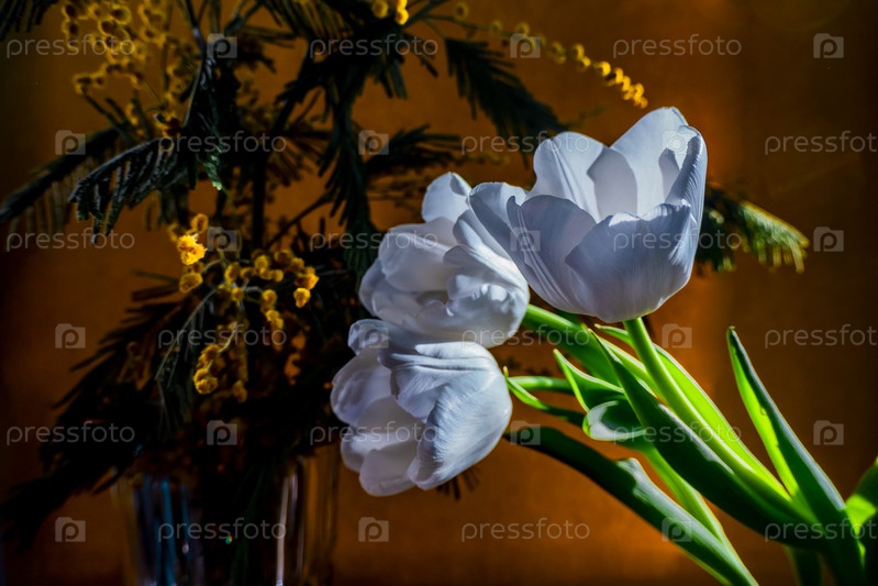 Белый тюльпан и мимоза на оранжевом фоне