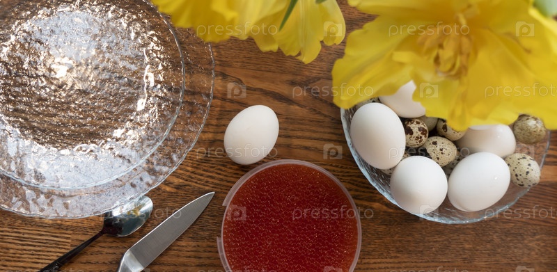 Вид сверху на миску с вареными яйцами и красной икрой на деревянном столе, здоровый завтрак