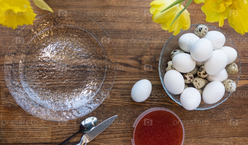 Вид сверху на миску с вареными яйцами и красной икрой на деревянном столе, здоровый завтрак