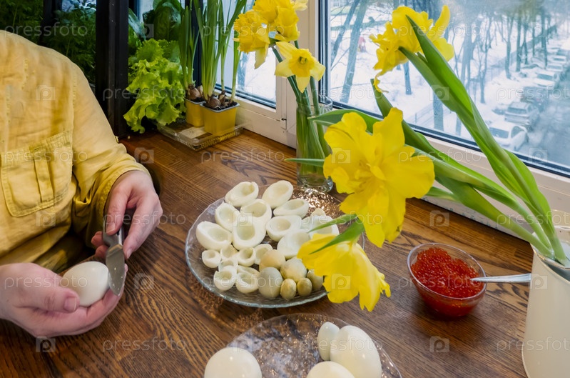 Шаг за шагом. яйцо, разрезанное пополам, для приготовления фаршированных яиц