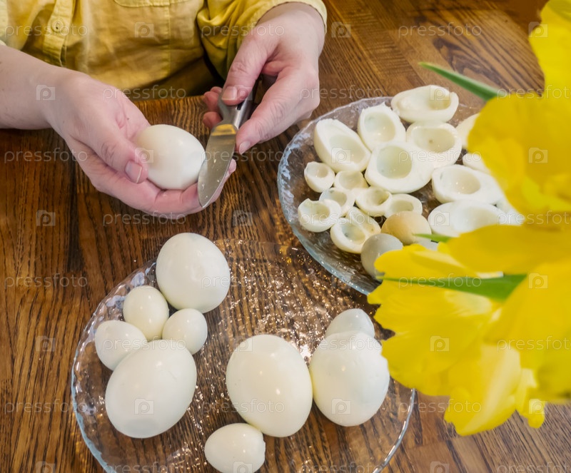 Шаг за шагом. яйцо, разрезанное пополам, для приготовления фаршированных яиц