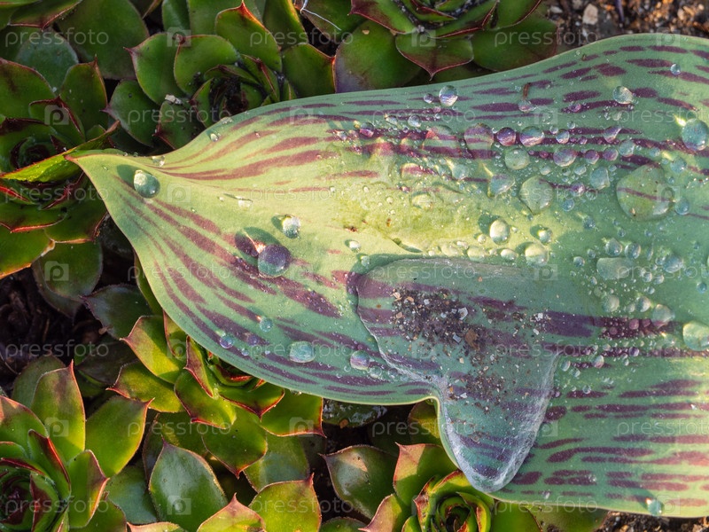 Капли воды на весеннем зеленом листе крупным планом. Лист тюльпана с каплями росы в саду на фоне сочной листвы в солнечном свете