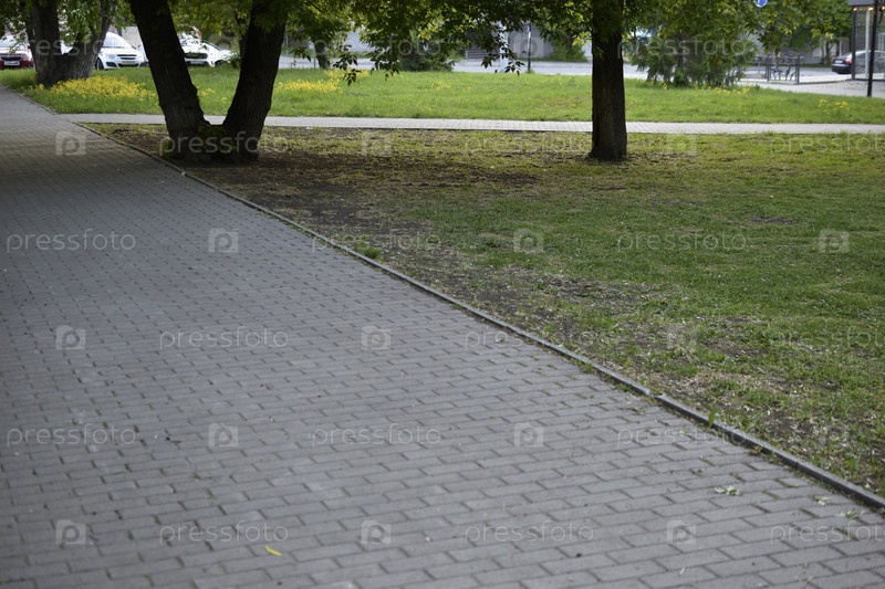 Деревья и дорожка в летнем городском парке. Красивая зелень и летний парк