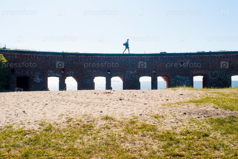 Человек идет по стене форта Вестерн на Балтийском Косе