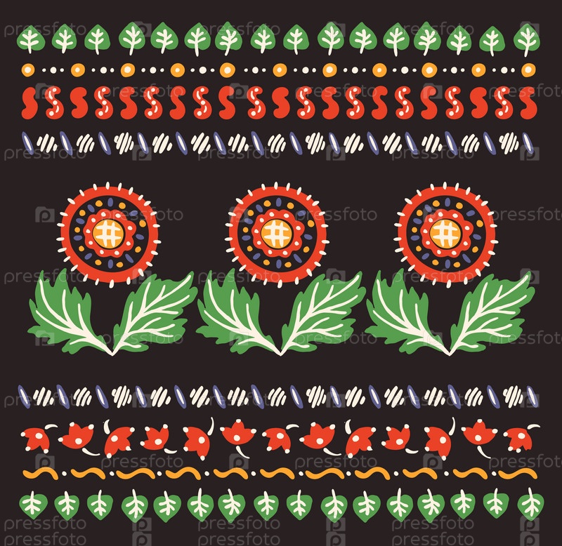 Набор этнических элементов. Бордюр представляет собой полосу с цветами, листьями, ветками, вензелями. Народная вышивка. Славянский, украинский, русский мотив. Хохлома, матрешка, дымковская игрушка. Мексиканский, индийский, цыганский ковер. Вязаное кружево