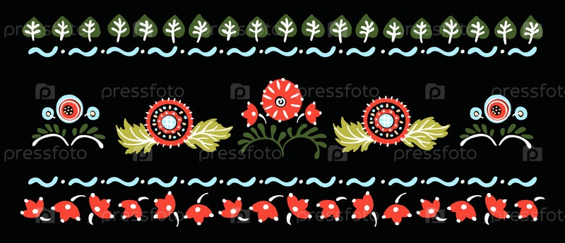 Набор этнических элементов. Бордюр представляет собой полосу с цветами, листьями, ветками, вензелями. Народная вышивка. Славянский, украинский, русский мотив. Хохлома, матрешка, дымковская игрушка. Мексиканский, индийский, цыганский ковер. Вязаное кружево