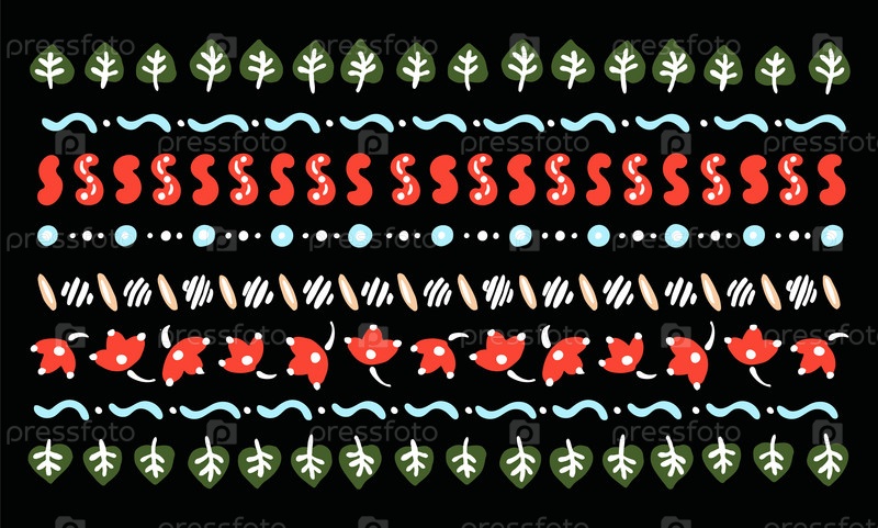 Набор этнических элементов. Бордюр представляет собой полосу с цветами, листьями, ветками, вензелями. Народная вышивка. Славянский, украинский, русский мотив. Хохлома, матрешка, дымковская игрушка. Мексиканский, индийский, цыганский ковер. Вязаное кружево