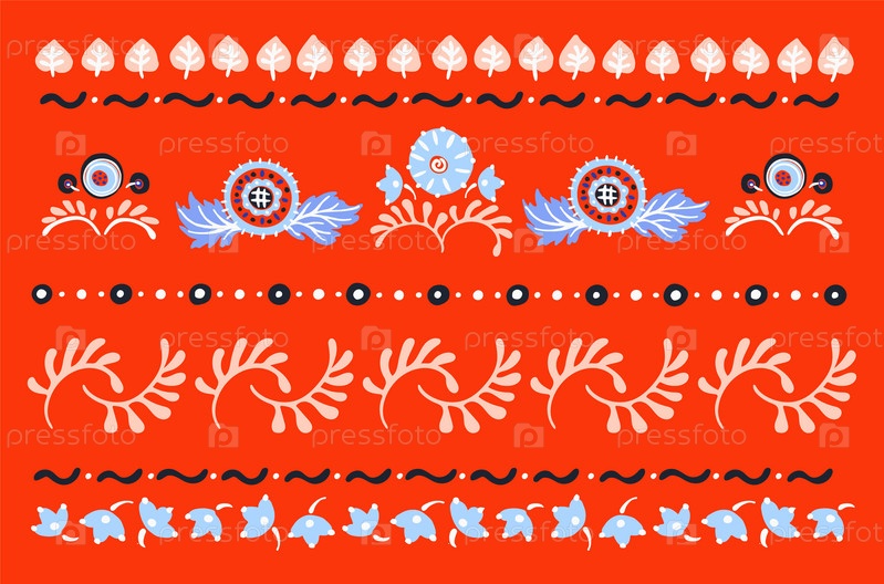 Набор этнических элементов. Бордюр представляет собой полосу с цветами, листьями, ветками, вензелями. Народная вышивка. Славянский, украинский, русский мотив. Хохлома, матрешка, дымковская игрушка. Мексиканский, индийский, цыганский ковер. Вязаное кружево