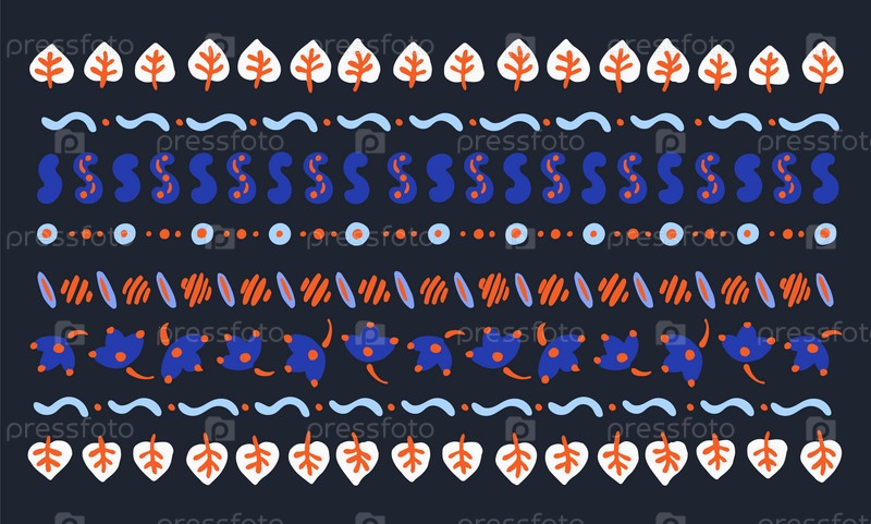 Набор этнических элементов. Бордюр представляет собой полосу с цветами, листьями, ветками, вензелями. Народная вышивка. Славянский, украинский, русский мотив. Хохлома, матрешка, дымковская игрушка. Мексиканский, индийский, цыганский ковер. Вязаное кружево