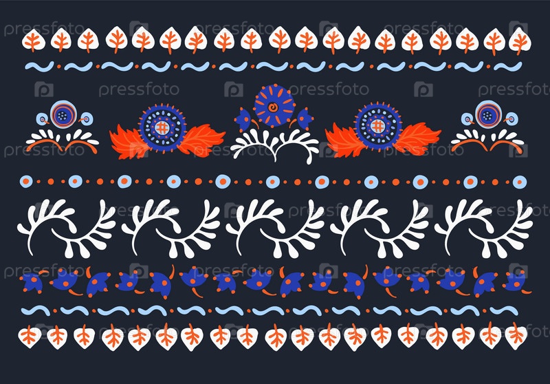 Набор этнических элементов. Бордюр представляет собой полосу с цветами, листьями, ветками, вензелями. Народная вышивка. Славянский, украинский, русский мотив. Хохлома, матрешка, дымковская игрушка. Мексиканский, индийский, цыганский ковер. Вязаное кружево