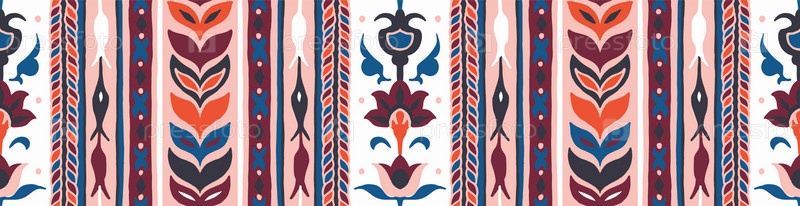 Геометрический дамасский орнамент. Икат границы. Этническая вышивка с листьями и монограммами. Племенная векторная текстура. Бесшовный народный узор в ацтекском стиле. Индийский, скандинавский, цыганский, мексиканский, африканский ковер