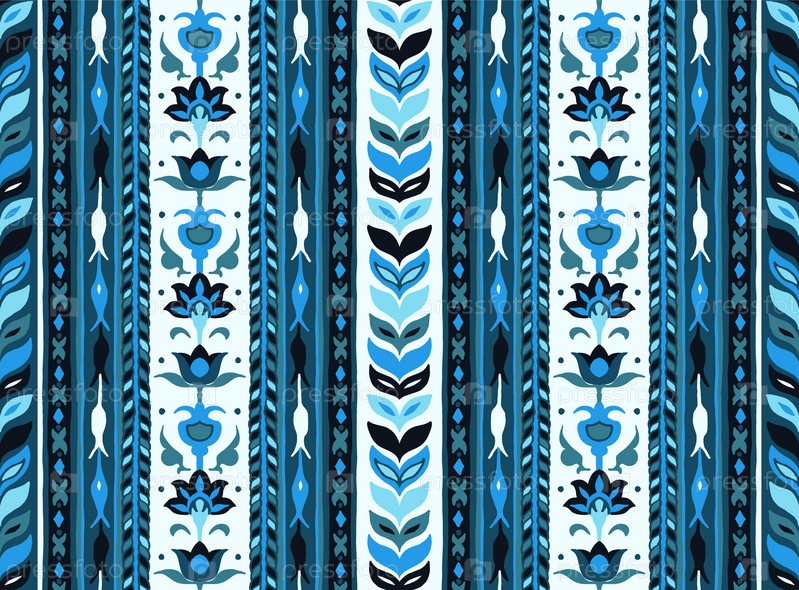 Геометрический дамасский орнамент. Икат границы. Этническая вышивка с листьями и монограммами. Племенная векторная текстура. Бесшовный народный узор в ацтекском стиле. Индийский, скандинавский, цыганский, мексиканский, африканский ковер