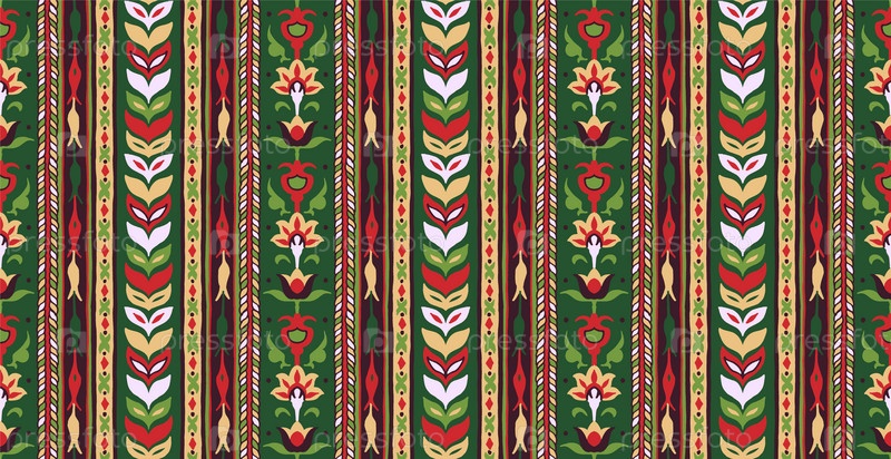 Геометрический дамасский орнамент. Икат границы. Этническая вышивка с листьями и монограммами. Племенная векторная текстура. Бесшовный народный узор в ацтекском стиле. Индийский, скандинавский, цыганский, мексиканский, африканский ковер