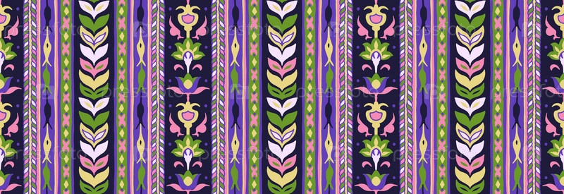 Геометрический дамасский орнамент. Икат границы. Этническая вышивка с листьями и монограммами. Племенная векторная текстура. Бесшовный народный узор в ацтекском стиле. Индийский, скандинавский, цыганский, мексиканский, африканский ковер