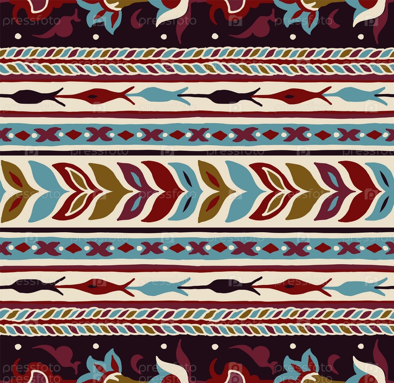 Геометрический фольклорный орнамент икат. Племенная этническая векторная текстура. Бесшовный полосатый узор в стиле ацтеков. Рисунок племенной вышивки. Индийский, скандинавский, цыганский, мексиканский, народный узор