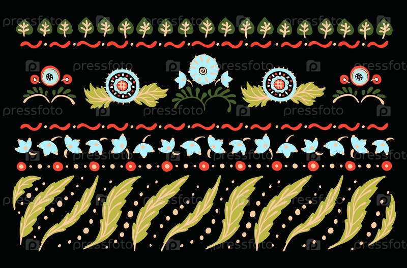 Набор этнических элементов. Бордюр представляет собой полосу с цветами, листьями, ветками, вензелями. Народная вышивка. Славянский, украинский, русский мотив. Хохлома, матрешка, дымковская игрушка. Мексиканский, индийский, цыганский ковер. Вязаное кружево