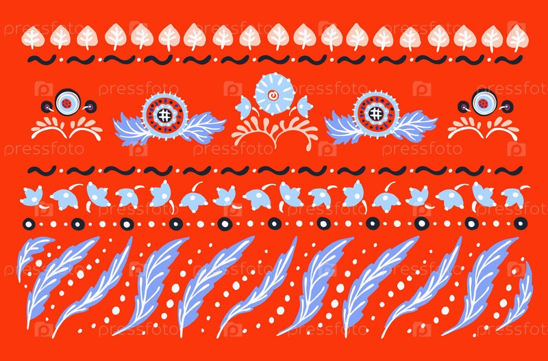 Набор этнических элементов. Бордюр представляет собой полосу с цветами, листьями, ветками, вензелями. Народная вышивка. Славянский, украинский, русский мотив. Хохлома, матрешка, дымковская игрушка. Мексиканский, индийский, цыганский ковер. Вязаное кружево