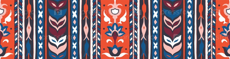 Геометрический дамасский орнамент. Икат границы. Этническая вышивка с листьями и монограммами. Племенная векторная текстура. Бесшовный народный узор в ацтекском стиле. Индийский, скандинавский, цыганский, мексиканский, африканский ковер