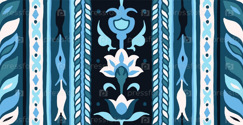 Геометрический дамасский орнамент. Икат границы. Этническая вышивка с листьями и монограммами. Племенная векторная текстура. Бесшовный народный узор в ацтекском стиле. Индийский, скандинавский, цыганский, мексиканский, африканский ковер